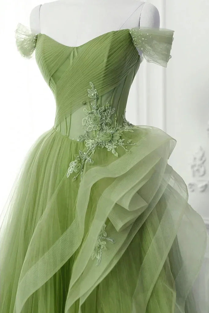 A-Line Blue Tulle Lace Long Formal Dress Off the Shoulder Formal Evening Dress