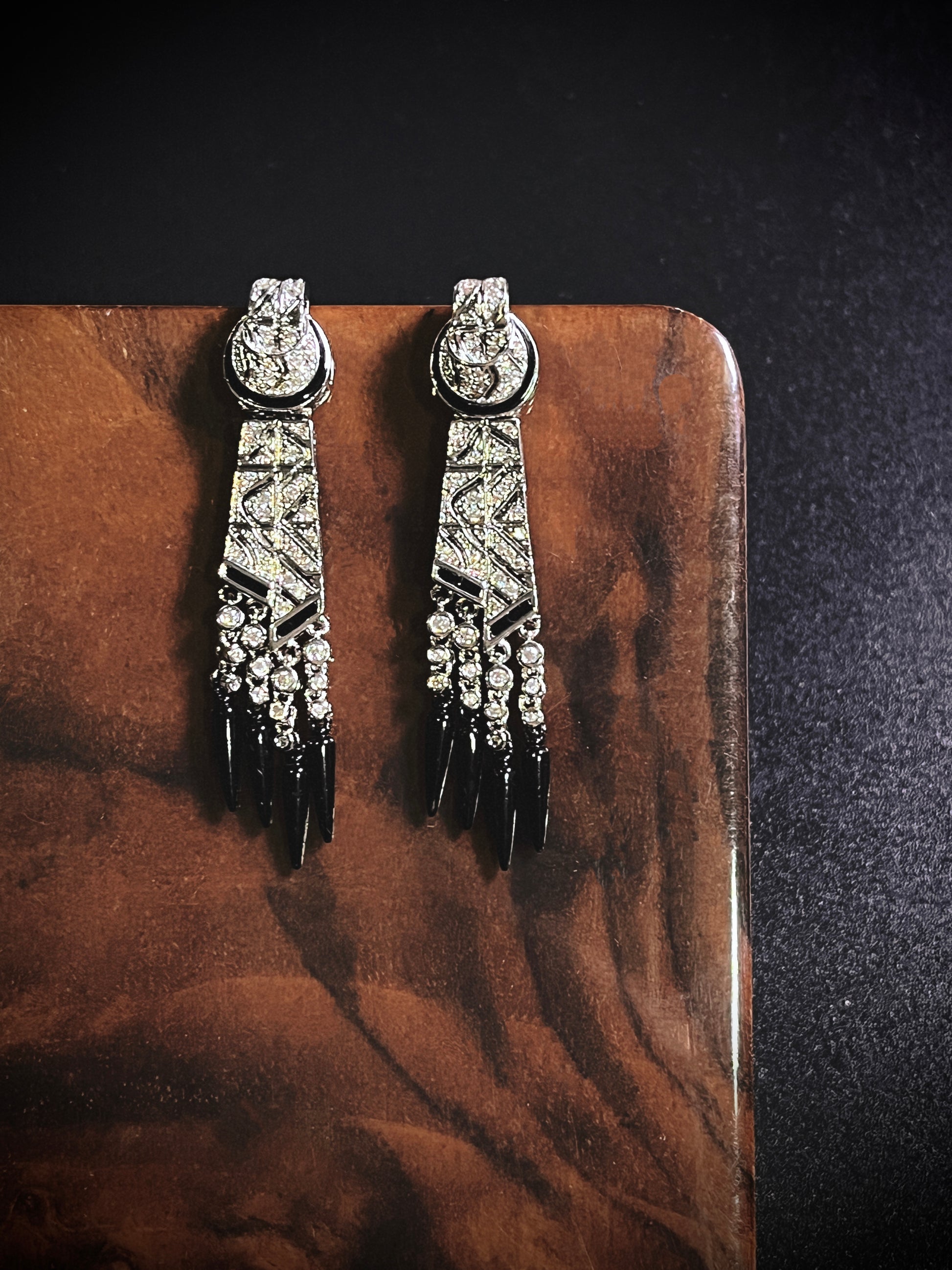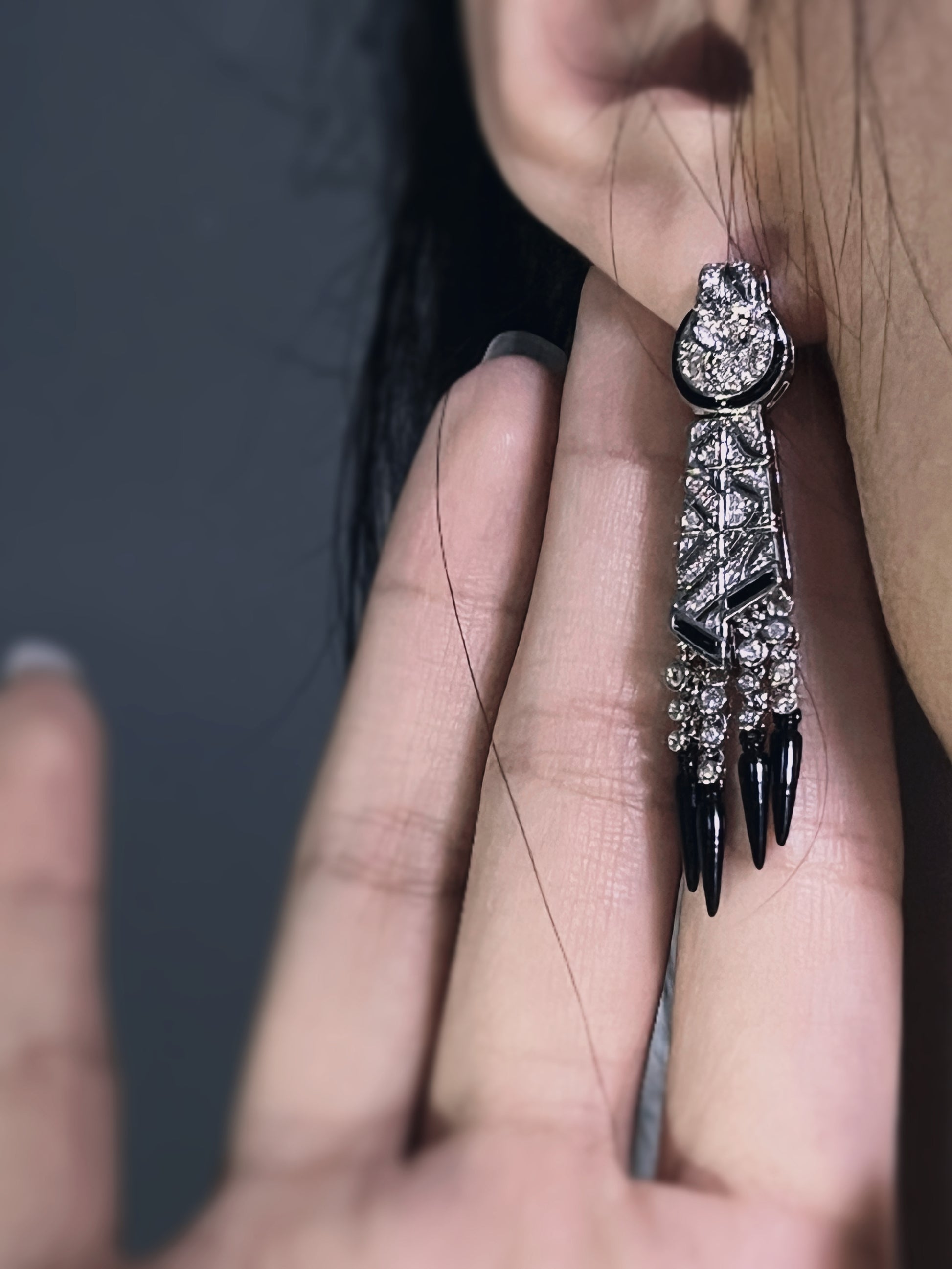 These striking earrings are a masterful reproduction of Art Deco-era Western antique jewelry, embodying a niche, vintage charm. Featuring deep black onyx and accented with high-quality artificial zircon and hand-applied enamel, they exude bold yet elegant sophistication. Perfect for those seeking unique, high-end accessories with a timeless retro aesthetic.