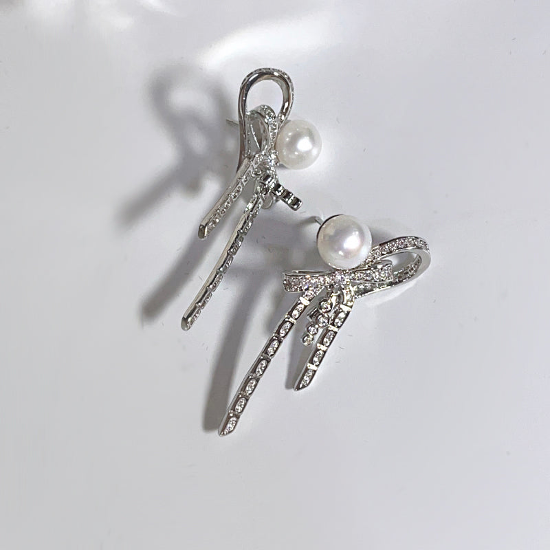 These unique earrings feature a niche, sweet-meets-cool design with delicate bow and ribbon motifs, accentuated by natural high-luster freshwater pearls. Crafted with meticulous attention to detail, they blend playful charm with sophisticated elegance, making them perfect for those seeking distinctive, high-quality accessories with a touch of personality.
