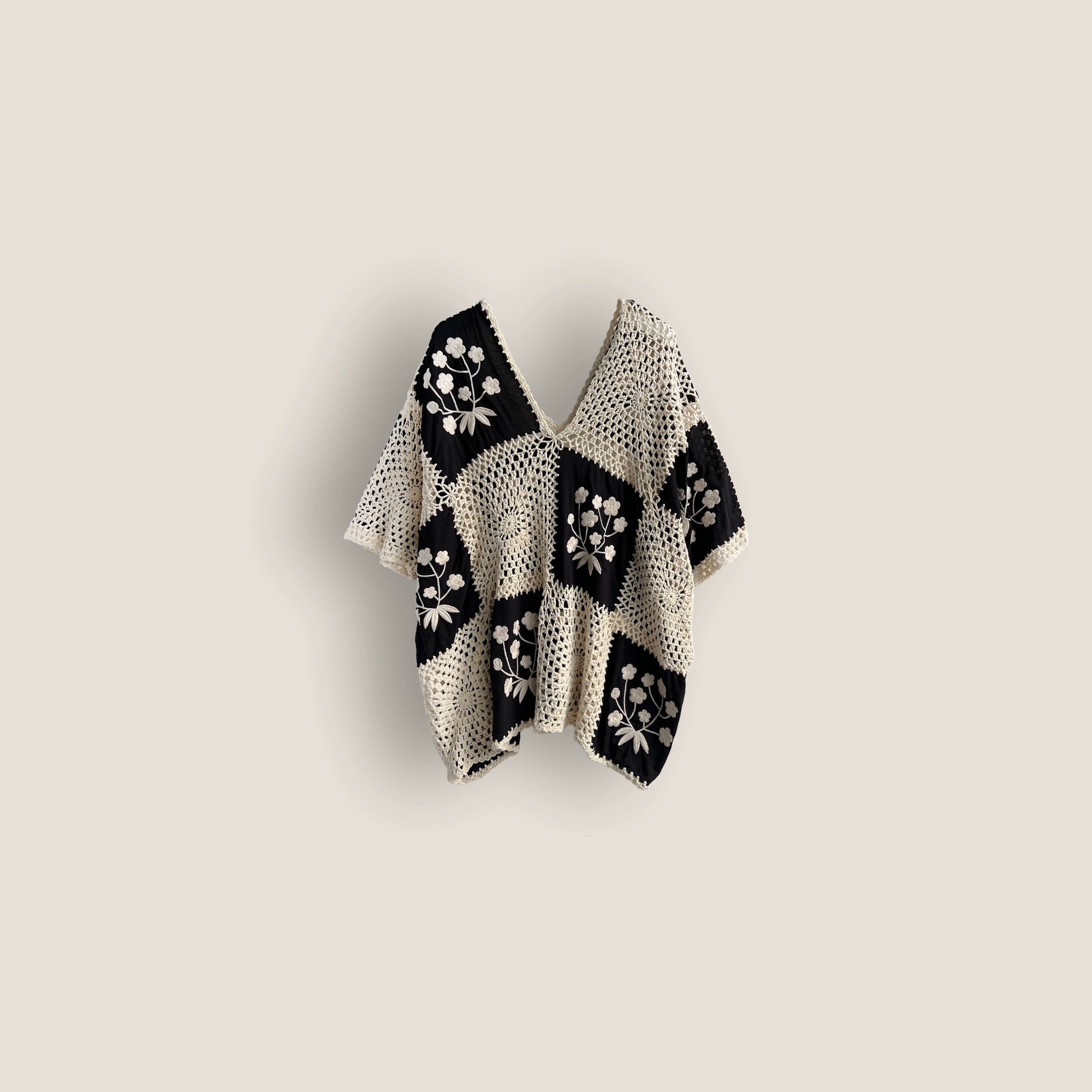 Retro Ethnic Hand-Crocheted Granny Square Hollow-Out Loose Color-Block Knit Top