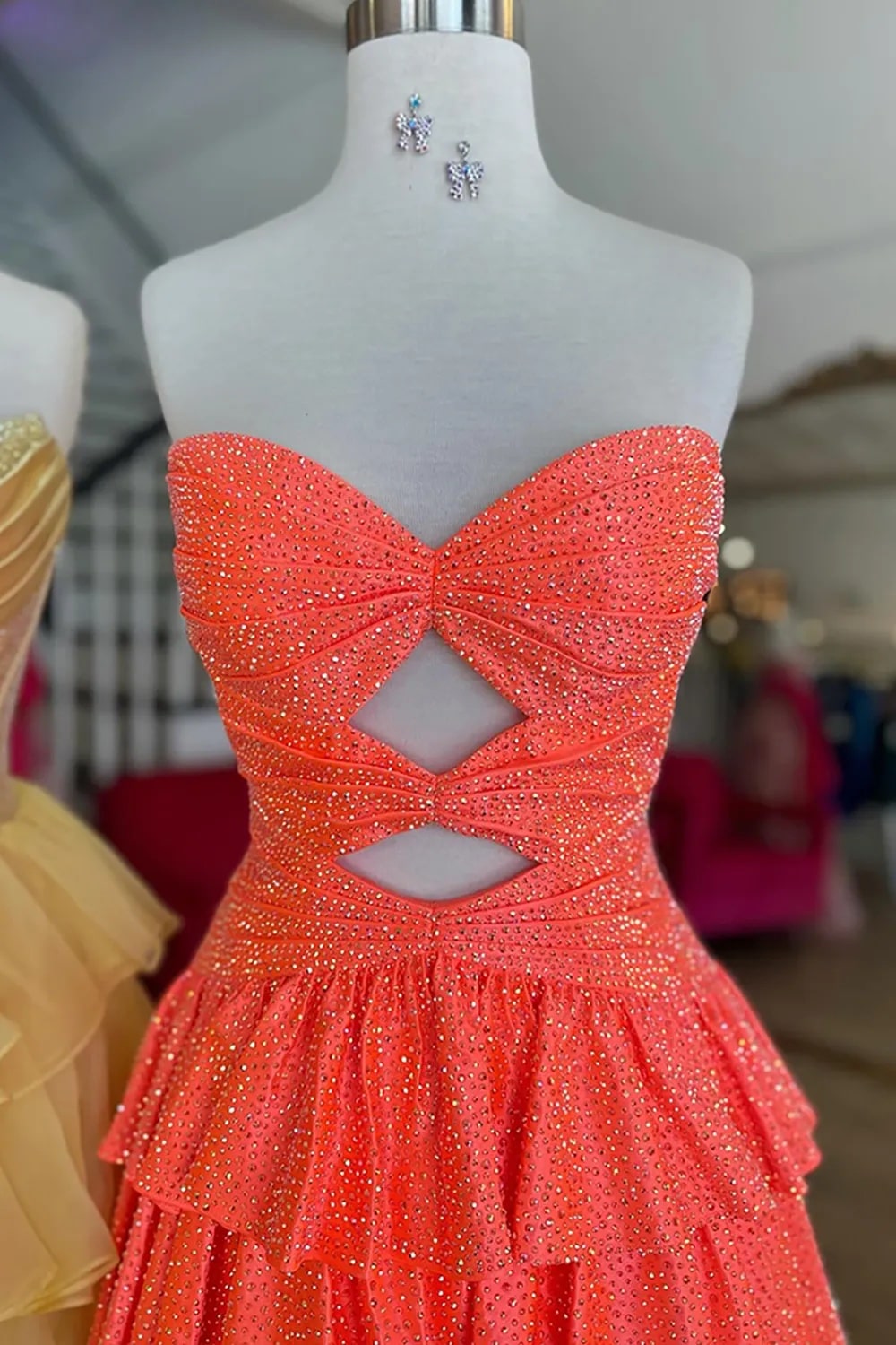 Design: Command attention in this stunning royal blue strapless dress, designed to exude confidence and glamour. The fitted A-line bodice sparkles with intricate beaded rhinestones and bold cut-out details, adding a daring yet playful touch. The tiered ruffle skirt cascades with lively movement, making every step—and every twirl—utterly captivating. The adjustable lace-up back ensures a flawless, personalized fit for effortless elegance.