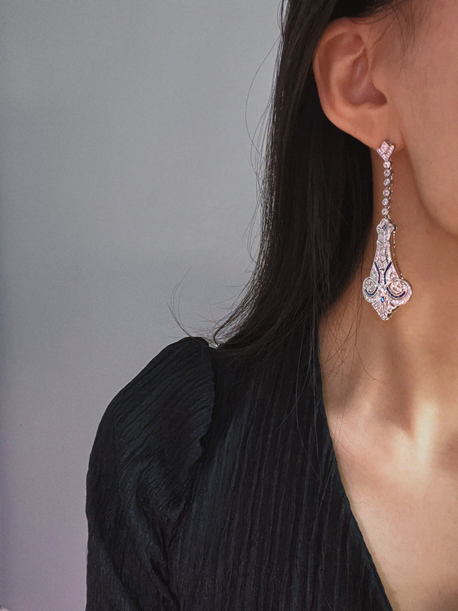 These ultra-long earrings are a stunning reproduction of Western antique jewelry, embodying a niche, vintage charm. Featuring a captivating blue hue from high-quality artificial zircon, they exude timeless elegance and sophistication, perfect for those seeking distinctive, high-end accessories with a retro aesthetic.